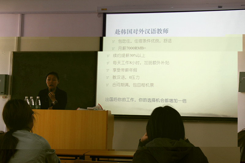 5月12日下午三點,我院邀請子宇漢語的赴韓項目負責人是晨媛老師于5A111為我院大三本科生面對面詳細解析赴韓對外漢語教師項目。 本次宣講會分為三個部分:了解企業文化、了解赴韓項目的各項細節和提問環節。宣講會伊始,是老師就在屏幕上打出了子宇漢語的特色标志,并介紹了子宇漢語做面對的客戶的對象以及目前子宇漢語招收的各類職位。 是老師在詢問同學們大多的求職目标都集中在教育行業後,便着重介紹了赴韓對外漢語教師項目。她以同學們最關心的薪資和簽證問題作為切入口,向同學們分門别類的介紹了在不同韓國院校的不同待遇和福利。在介紹過程中,同學們也不時地舉手提問,在問答中,是老師将整個赴韓項目中的各個環節和細節都逐一剖析。 提問涉及到了很多十分實際的問題,包括保險、醫療、加薪幅度等等,是老師毫不避諱地将最真實的情況與同學們分享,也以自身經曆舉例,向同學們介紹韓國院校最實際的情況。宣講結束後,是老師更是大方地留下了微信号,表示歡迎同學們繼續提出問題并願意與有興趣的同學們進一步交流溝通。 本次宣講貼合我院專業,讓同學們切實的了解到目前對外漢語教師這一行業所處的國際環境,同時也給予了有志于對外漢語教師這一行業的同學們一個更廣闊的舞台,讓他們能充分發揮自身專業特色,找到專業對口的工作。    |