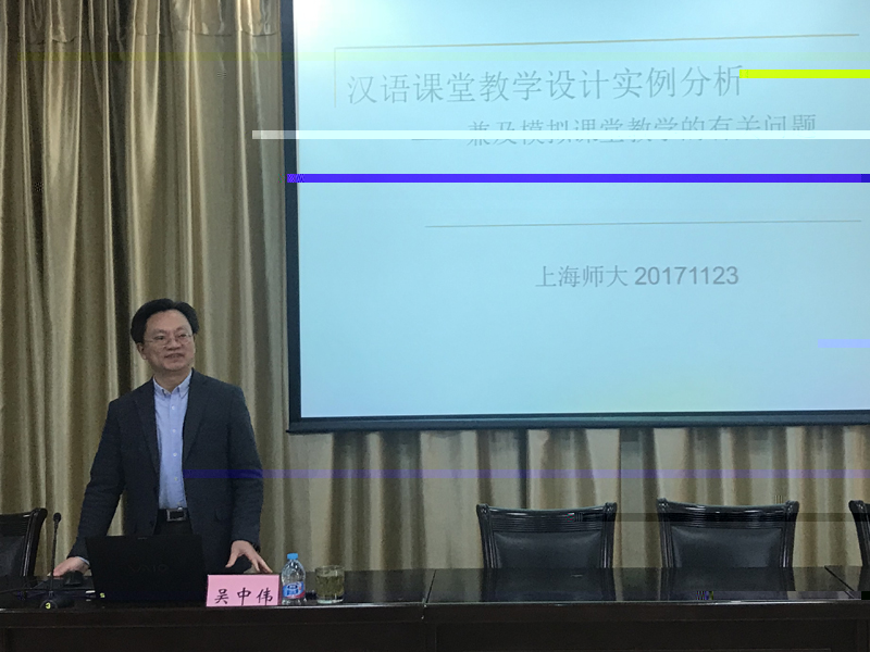 2017年11月23日下午一點,對外漢語學院在303多功能廳開展了一場題為“漢語課堂教學設計實例分析--兼及模拟課堂教學的有關問題”的講座。主講人為複旦大學國際文化交流學院院長、世界漢語教學學會理事吳中偉教授。